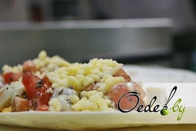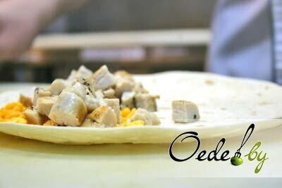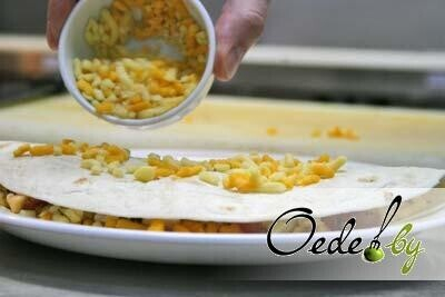 6. Берем лепешку тортилья или лаваш: выкладываем смесь сыров, куриную грудку и смесь томата с чесноком, потом снова посыпаем сыром.