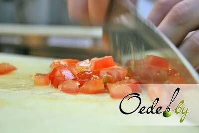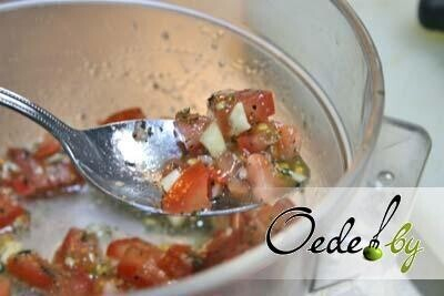 4. Для начинки нарезаем кубиками помидор, измельчаем (выдавливаем) чеснок и смешиваем с перцем и солью. При этом важно, чтобы томат пустил сок.