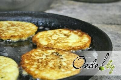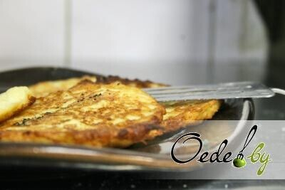 3. Приступаем к обжарке драников. На смазанной растительным маслом разогретой сковородке формируем картофельные оладьи толщиной не более 0,4 см. Обжариваем их с двух стороны до появления золотой корочки.