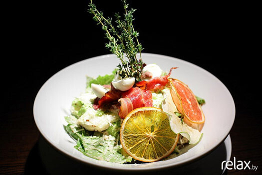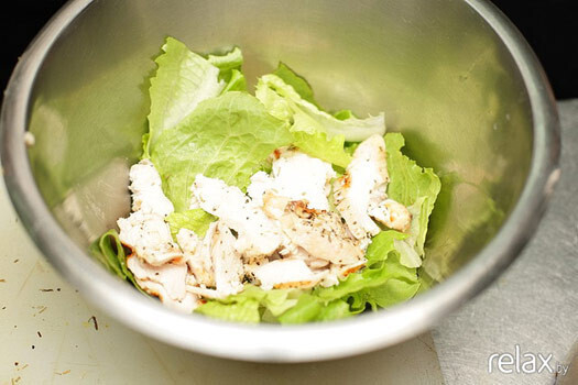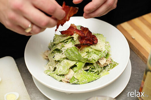 Классический салат «Цезарь» с куриной грудкой, анчоусами, чипсами из бекона панчетта и перепелиными яйцами