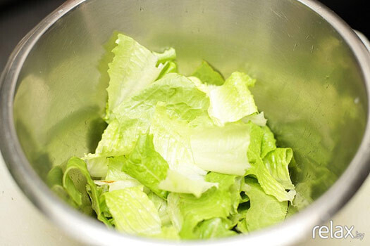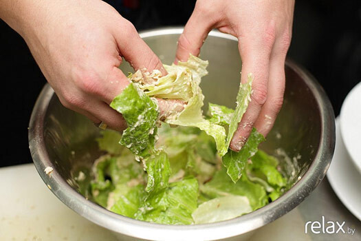 8. Ручным способом перемешиваем салат, чтобы соус обволок каждый листик, но листья не помялись.