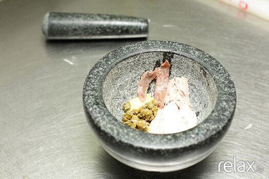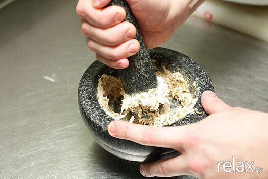 4. Перетираем в ступке или взбиваем миксером в однородную массу. Соус должен обволочь листья ромена и придать им пикантный вкус.