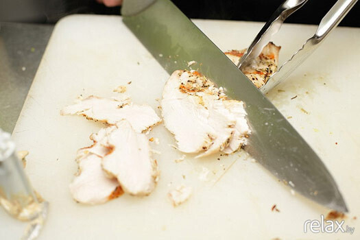 6. Нарезаем жареное куриное филе тонкими хлопьями.