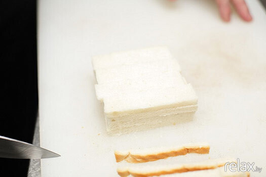 9. Нарезаем тостовый хлеб для гренок, отрезая корочку.