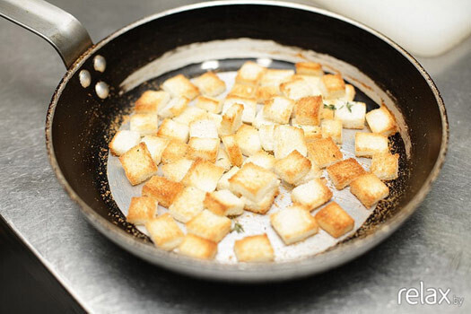 10. Обжариваем хлебные кубики и добавляем в салат.