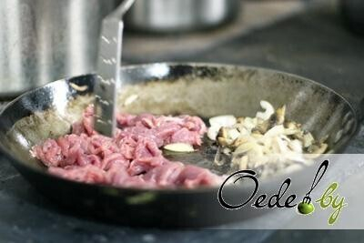 6. Затем туда же добавляем мясо. Через минут 10 заливаем 100-120 г воды и, периодически помешивая, тушим минут 20-25, пока говядина не станет мягкой.