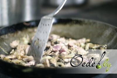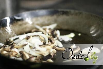 5. На сковородку выкладываем нарезанные шампиньоны и лук. Постоянно помешивая, тушим до золотистого цвета.