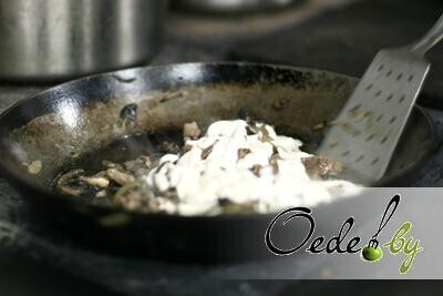 7. За 5 минут до готовности добавляем 70 г нежирной сметаны. Хорошо перемешиваем и продолжаем тушить на маленьком огне до готовности.