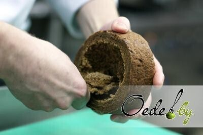 9. Чтобы изготовить хлебный горшочек, в котором будет подаваться блюдо, срезаем с хлеба верхнюю часть.