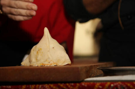3. Из теста делаются пирожки треугольной формы. В качестве начинки добавляются кусочки картофеля, горошек, сыр панир, корица, кориандр, черный перец, соль. Панир — традиционный индийский домашний сыр. Он готовится здесь же, в ресторане, с соблюдением всех технологий. Панир имеет творожную основу и обезжирен.