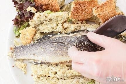 14. Теперь счищаем ножом остатки соли, делаем диагональный надрез под плавником и режем по хребту. Это позволяет легко отделить мясо от костей.