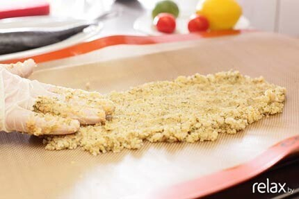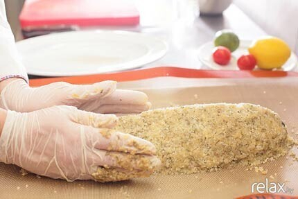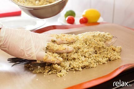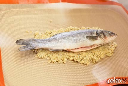 7. Теперь выкладываем на противень получившуюся массу. На нее кладем заранее очищенный сибас и «глиной» накрываем рыбу сверху. Придаем массе форму.