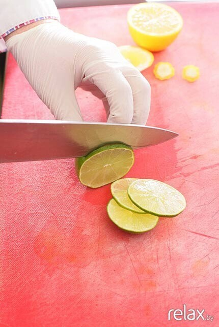 10. Теперь делаем съедобный цветок. Лайм режем тонкими кольцами — это будут листья.
