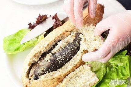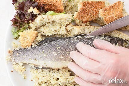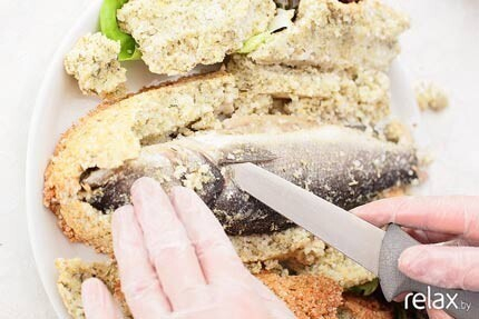 13. «Глина» была необходима исключительно для придания вкуса рыбе, поэтому несъедобная масса не идет в употребление. Аккуратно ножом делаем продольный разрез каркаса и раскрываем соляную массу, как хлеб.