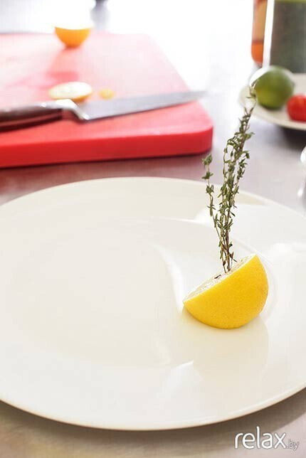 9. Берем половинку лимона и разрезаем ее под углом 45 градусов так, чтобы потом поставить на тарелку. Вставляем в лимон веточку тимьяна.