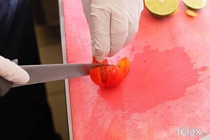 11. С помощью ножа превращаем черри в морской аленький цветочек. Аккуратно делаем крестовой надрез, не доходя даже до середины овоща, и раскрываем «лепестки».