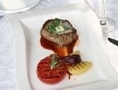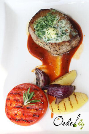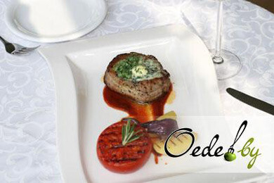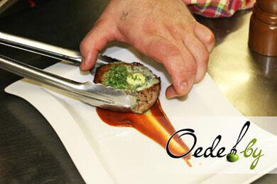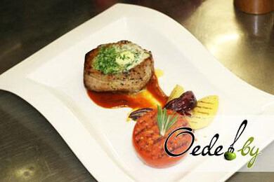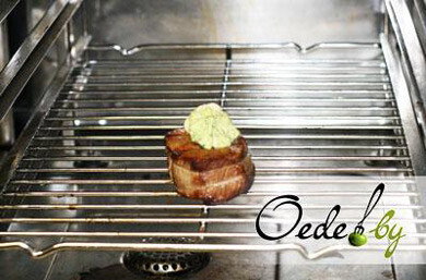 10. Когда свиной медальон готов, кладем на него кусочек зеленого масла и вновь помещаем мясо в духовку на пару минут, чтобы масло растаяло.