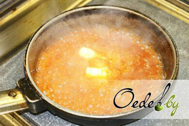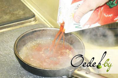 8. Самый интригующий этап приготовления блюда. На сковороду с разогретым растительным маслом выливаем немного томатного сока и белого вина, добавляем пару кусочков сливочного масла.