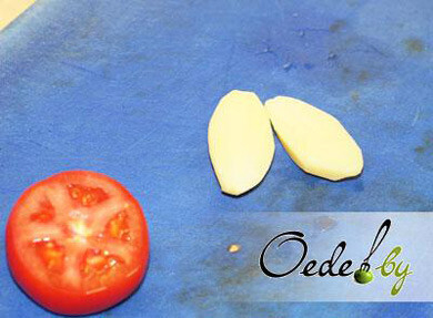 4. С помидора срезаем верхнюю часть, разрезаем лук на несколько частей, а отварной картофель — напополам.
