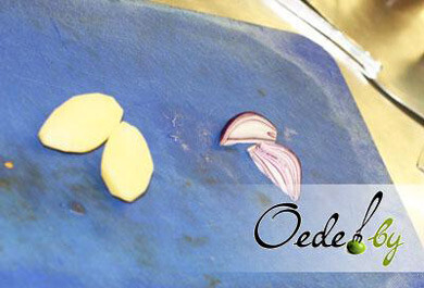 4. С помидора срезаем верхнюю часть, разрезаем лук на несколько частей, а отварной картофель — напополам.