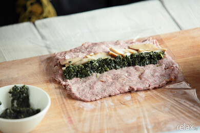 3. Подготовленный фарш (мясо, прокрученное через мясорубку с добавлением соли, перца, английского соуса «Ворчестер» и обжаренного лука) выкладываем тонким слоем на пищевую пленку.