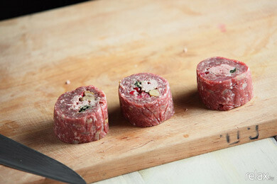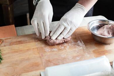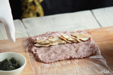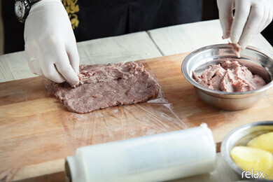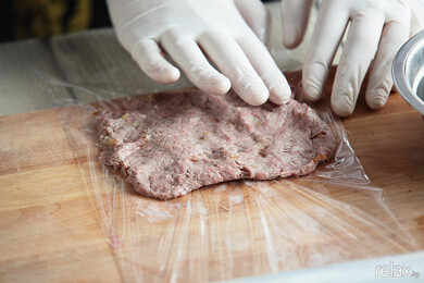 3. Подготовленный фарш (мясо, прокрученное через мясорубку с добавлением соли, перца, английского соуса «Ворчестер» и обжаренного лука) выкладываем тонким слоем на пищевую пленку.