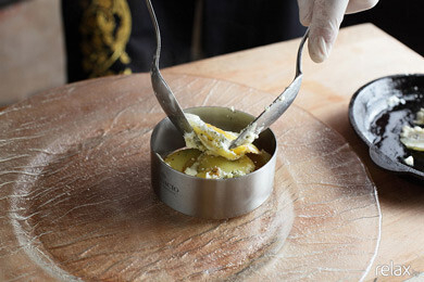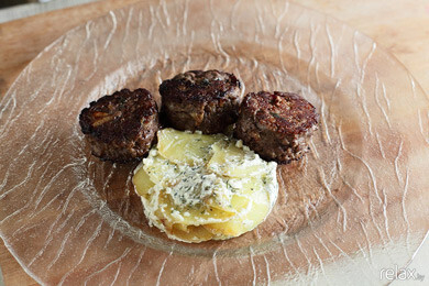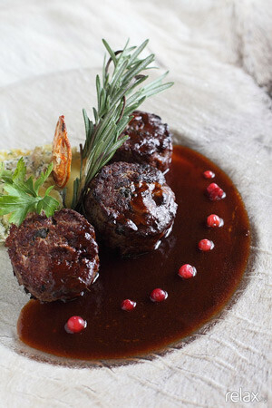 12. Готовый картофель выкладываем через специальное кольцо (в домашних условиях его можно сделать из обычной фольги). Рядом укладываем кусочки рулета, поливаем соусом из дичи* и украшаем веточками петрушки, розмарина, ягодами брусники и чипсом из лимона и помидора**.