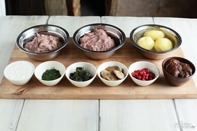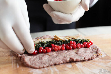 5. Рядом последовательно выкладываем белые грибы, шпинат (можно купить замороженный шпинат в магазине и после разморозки порубить до кашеобразного состояния) и моченую бруснику (замороженные ягоды замочить в водке с добавлением специй).