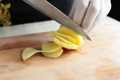 1. Нарезаем картофель для гарнира тонкими чипсами.