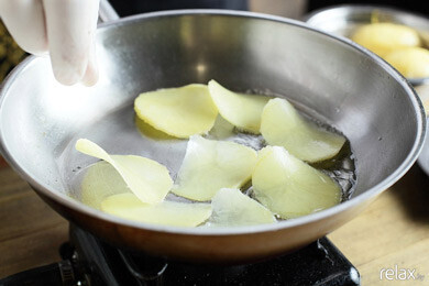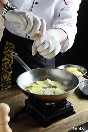 10. В это время начинаем приготовление гарнира. На растительном масле обжариваем нарезанный чипсами картофель, солим, перчим.