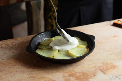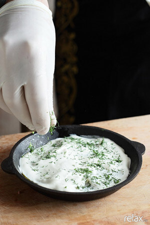 11. Затем выкладываем картофель в небольшую емкость (можно использовать сковороду для запекания), смазываем сметаной, посыпаем укропом и ставим в духовой шкаф на 6-7 минут при температуре 180 ⁰С.