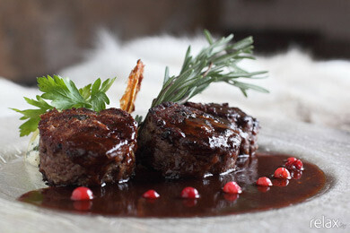 Мясо изюбря с белыми грибами, моченой брусникой и листьями шпината
