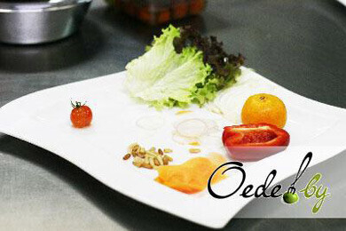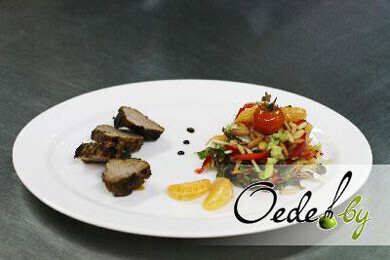 Оформить блюдо вы можете на свой вкус, а можете воспользоваться вариантом шеф-повара. На тарелку выложить несколько долек мандарина. При помощи формовочного кольца разместить салат рядом с мандарином, посыпать кедровыми орешками. Завершить композицию нужно свиными медальонами.