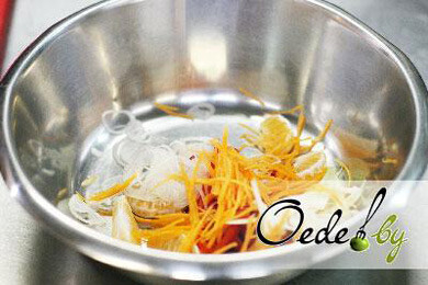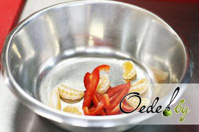 4. Пока готовится мясо, приготовим салат. Очищенный мандарин поделить на дольки, зеленый салат, перец, морковь, красный лук, фенхель порезать соломкой.