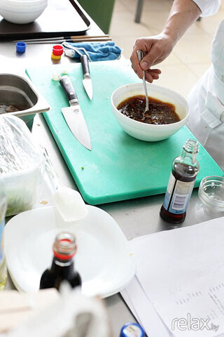 1. Сначала приготовьте соус. Для этого нужно просто смешать соевый соус, яблочный уксус, кунжутное масло и сахар и размешивать до тех пор, пока сахар полностью не растворится.