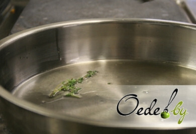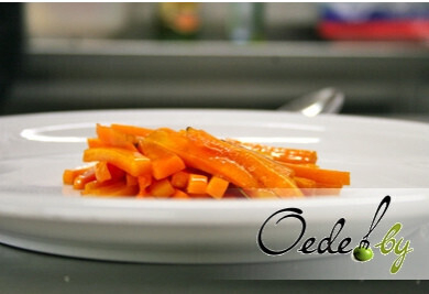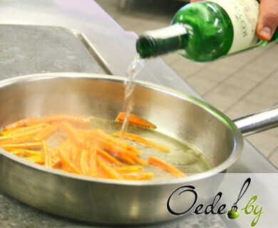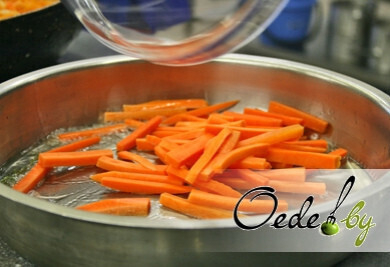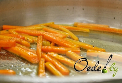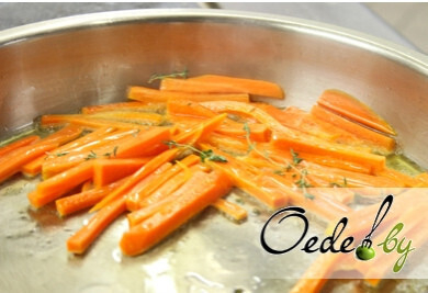 4. Приготовление гарнира. Очищенную морковь нарезаем брусками, просушиваем, затем обжариваем в растительном масле в заранее разогретой сковороде. Кстати, масло можно ароматизировать веточкой тимьяна. Сразу же добавляем в сковороду с морковью вино и выпариваем его. И только после выпаривания вина добавляем мед. Необходимо постоянно помешивать морковь, чтобы она обжарилась, но осталась сочной внутри.