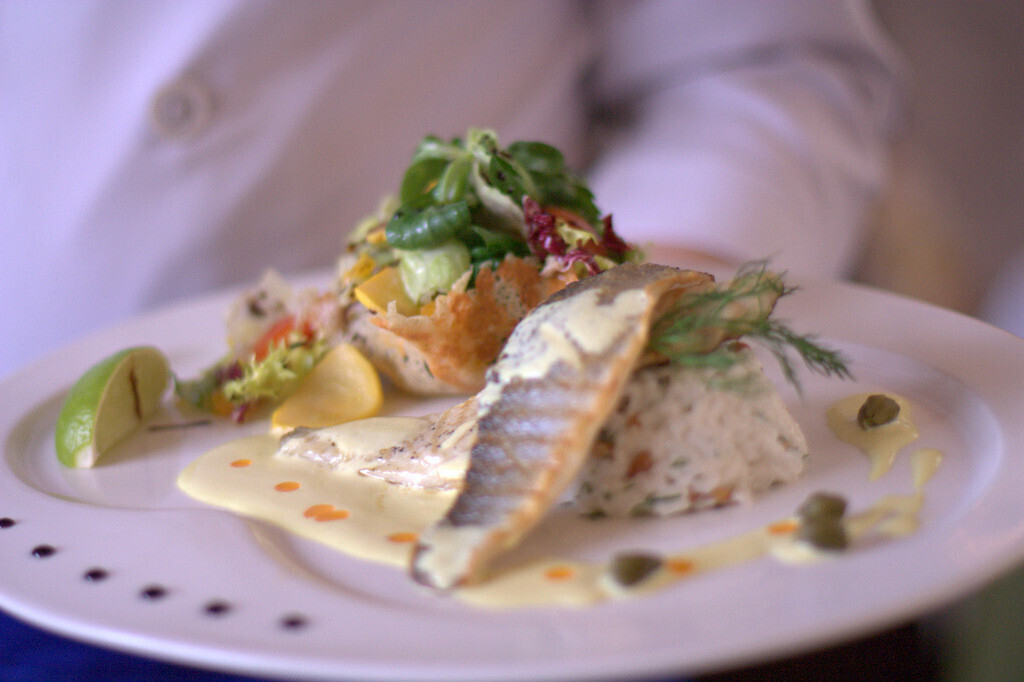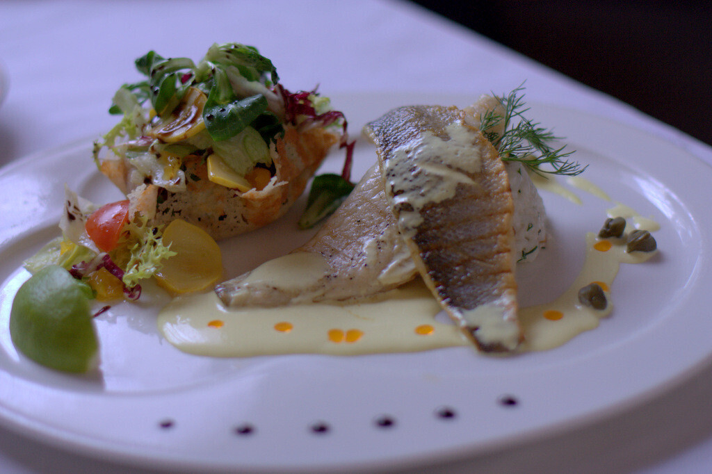 Филе сибаса (120 г.) посыпаем солью и перцем и обжариваем на нагретой сковороде с добавлением растительного масла. По косой надрезаем кожу и кладем кожей вниз. Доводим до готовности пару минут в духовке. Соус: сливки 22 %, шафран, соль, сок лимона. Шафран предварительно замачивается в небольшом количестве воды.