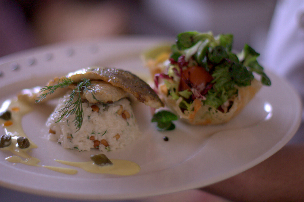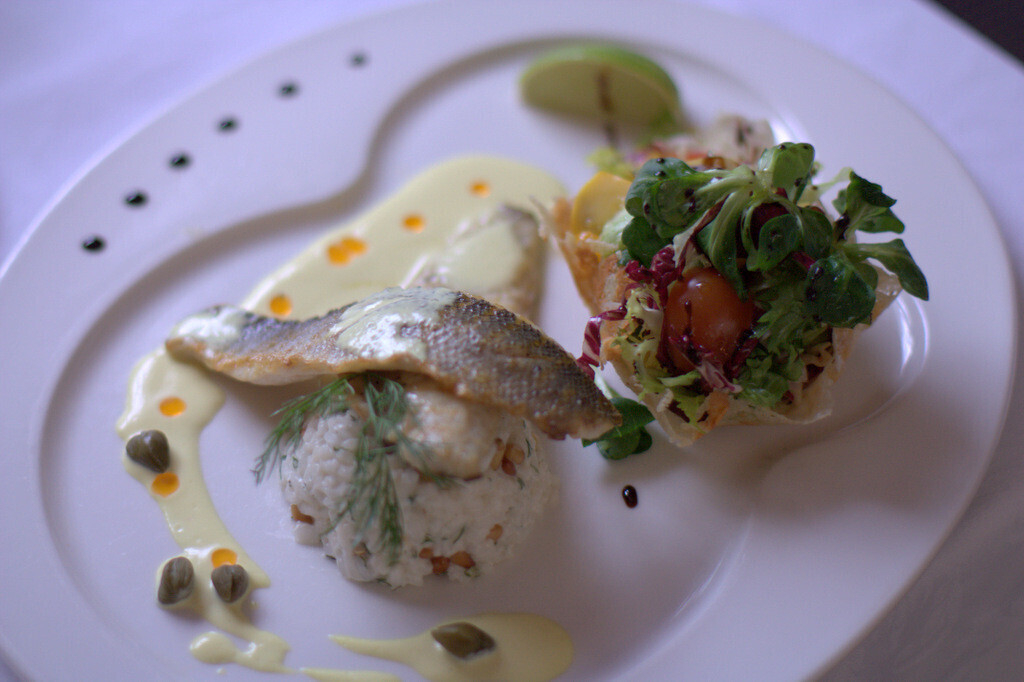 Филе сибаса со сливочным ризотто и летним салатом