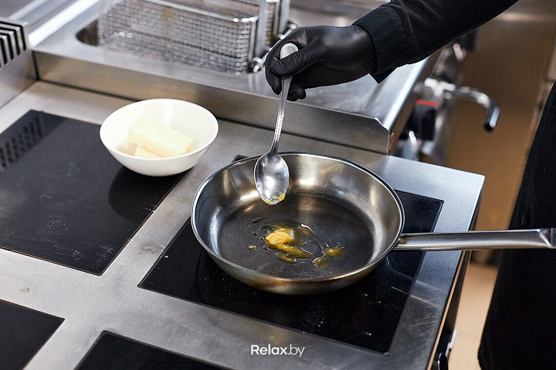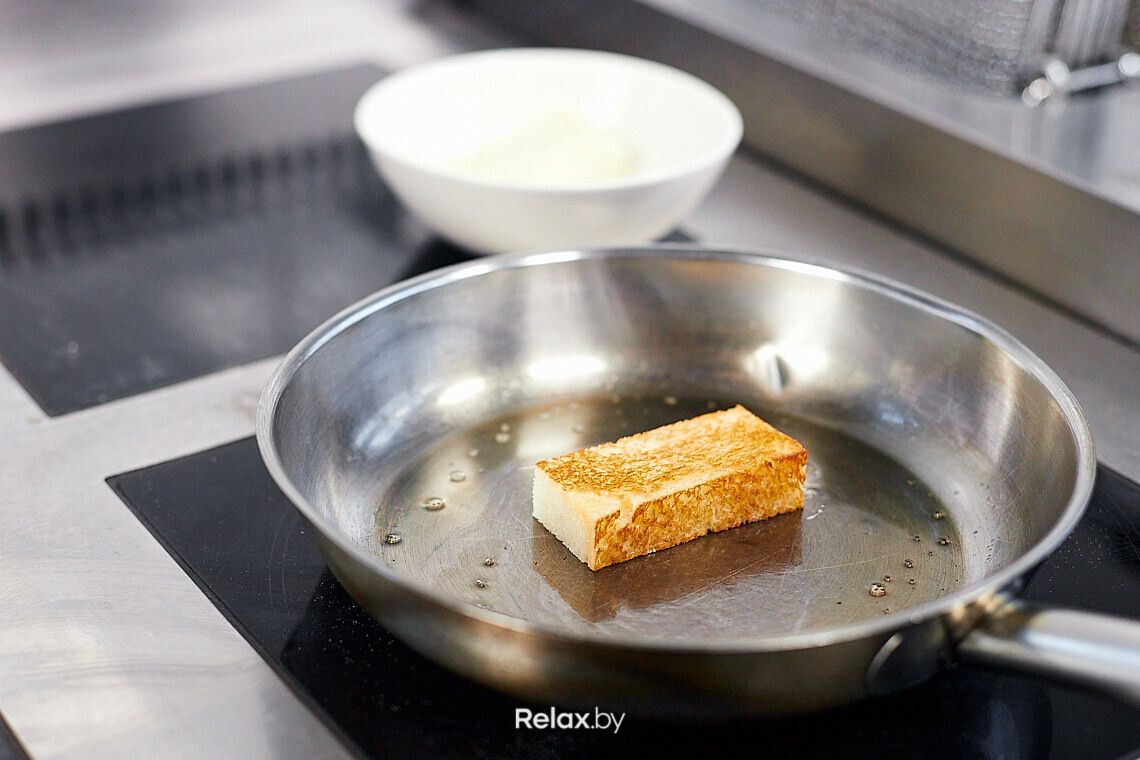 Обжариваем бриошь на небольшом количестве сливочного масла до золотистой корочки. Если умеете делать масло нуазет (очищенное от молочных белков и влаги), можно использовать его. Так бриошь дополнится легким ароматом жареных орехов.