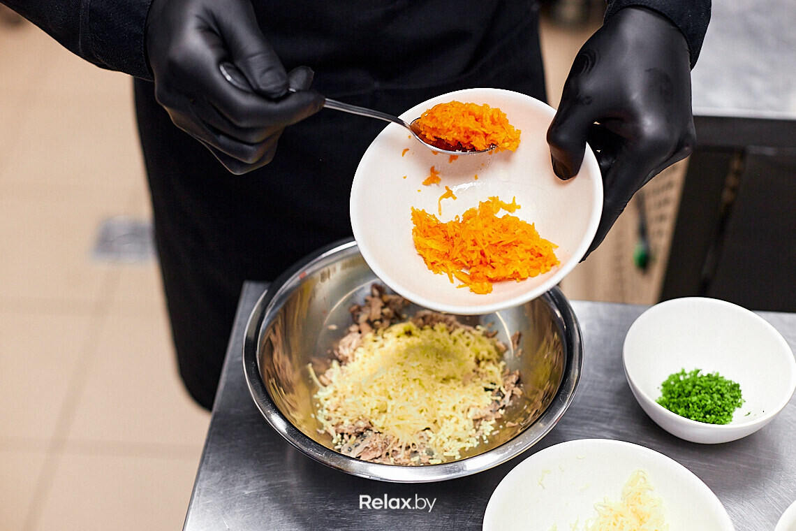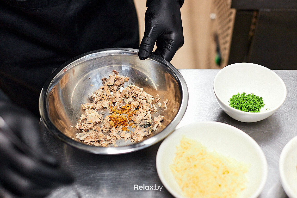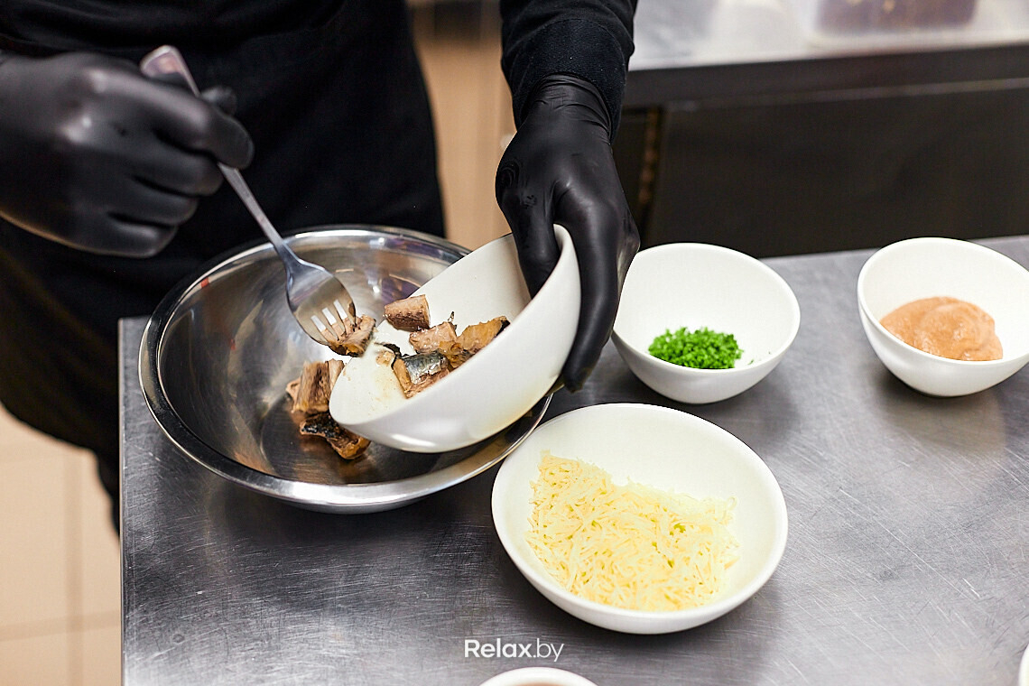 Важный момент: в процессе приготовления используем только мелкую терку. Отлично, если на вашей кухне есть продукция Microplane. Натираем вареный картофель, морковь, вареный яичный желток. Консервированного судака растираем вилкой в емкости, в которой будем замешивать салат. Добавляем луковый кранч, который ответит за легкий хруст. Перемешиваем с пряным соусом — альтернативой жирному майонезу. В «Ресторане 1» его готовят на основе яичных желтков, чили, кунжутного масла, соевого соуса и чеснока. В торговых сетях есть уже готовые варианты, ищите в отделах с японскими продуктами соус спайси, он тоже отлично подойдет.