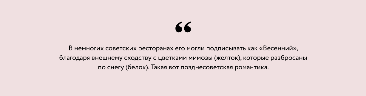 Автор «Мимозы» в 70-х остался неизвестным: как будто это сочетание продуктов всегда витало в воздухе или было записано в книги советских домохозяек. Блюдо так быстро стало популярным, что, не стесняясь, потеснило названные выше салаты.