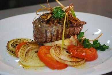 Говяжью вырезку жарим на чугунной рифленой сковороде или на простой сковороде (для дома) со всех сторон. В конце жарки солим, перчим. Свежие лук и томат нарезаем кольцами, обжариваем на растительном масле. На тарелку, в центр, выкладываем картофельное пюре, на него жареный стейк. Жареный лук и томат выкладываем рядом с мясом. Украшаем луком пореем, обжаренным на растительном масле (фритюр), шариком сливочного масла, который мы предварительно обваляли в рубленой зелени. Приятного аппетита!