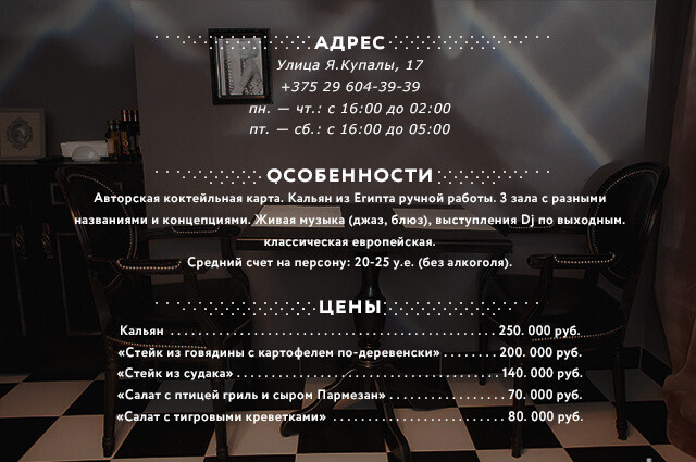 «Мы открыты для всех. И хотим, чтобы гости тоже нам открывались: общались с нами, делились своими идеями, пожеланиями…. Присели на барную стойку? Отлично! Бармен даст вам свою визитку, расскажет о наших последних новостях, поделится рецептом коктейля. Не понравилось у нас? Не проблема! Мы совсем не обидимся и посоветуем вам другие заведения города, если нужно — закажем в них столик».