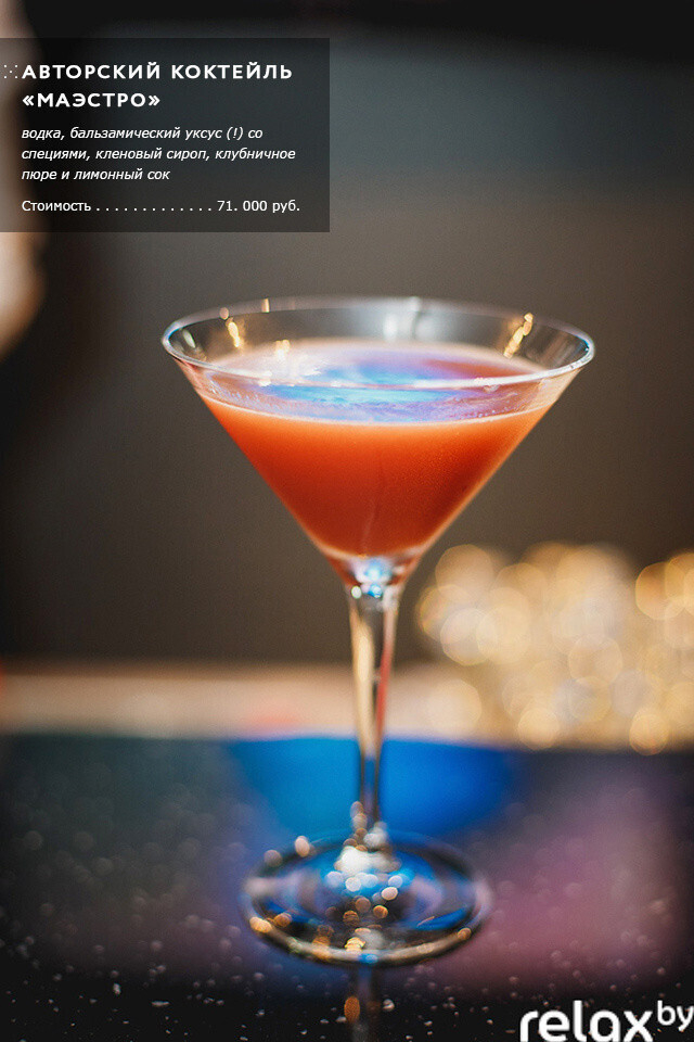 «Готовим коктейль «Маэстро» с очень необычным составом. Это водка, бальзамический уксус (!) со специями, кленовый сироп, клубничное пюре и лимонный сок. Использую шейкер. Стоит такой коктейль 71. 000 рублей. Что же касается декора, то стараемся использовать его минимально. Главное — вкус!». |