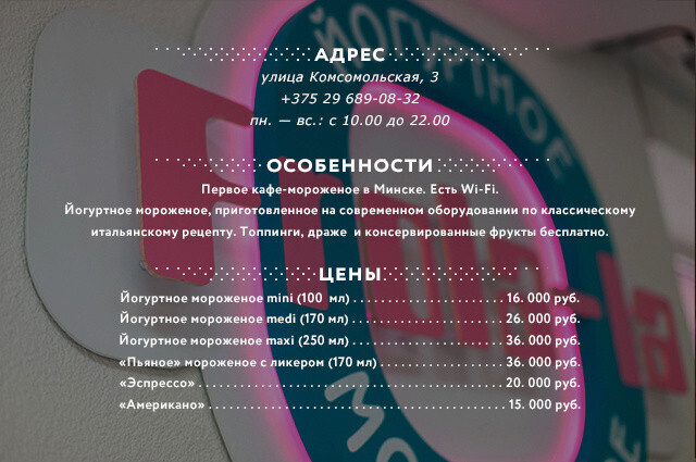 Еще одно любопытное городское открытие — кафе «Frola-la» в самом центре Минска (улица Комсомольская, 3). Нам рассказали, что такой формат очень популярен в Европе. У нас же заведение можно смело назвать первым кафе-мороженым в столице. К слову, мороженое здесь готовят по итальянскому рецепту: это Frozen Yogurt. Итак, пробуем…