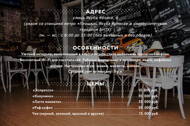 | «Приятно, что улица Якуба Коласа начинает оживать. И я рад, что моя кофейня здесь первая. Что же касается конкуренции, то ее нет. В Минске остро не хватает не то что кофеен, но и просто демократичных и уютных заведений, куда не нужно собираться и выбирать наряд, а просто заглянуть, проходя мимо. Пусть на этой улице откроется еще 10 кофеен! Уверен, что в каждой из них всегда будут посетители». |