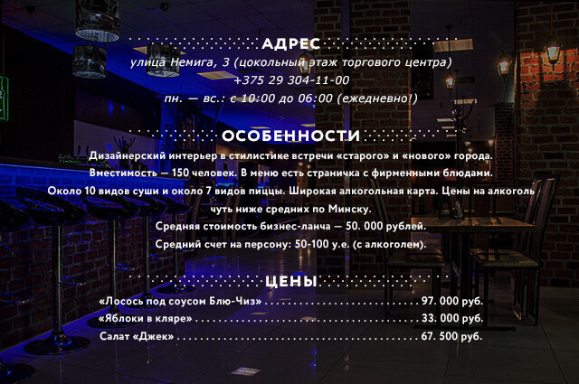 | «Работая в самом центре столицы, сложно отказаться от суши, пиццы, классических салатов. На это есть спрос, эти блюда выбирают, их постоянно спрашивают. Поэтому мы решили, что экспериментировать с кухней будет ошибочно и неверно. Кроме того, в районе Немиги всегда много иностранцев, и эти блюда им понятны. Отмечу, что меню будет довольно объемным, будем дополнять его новыми блюдами. В ближайшем будущем планируем и детское меню». |