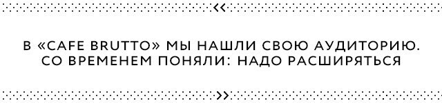 «В первом кафе мы уже «нащупали» свой сегмент, в «Cafe Brutto» появилась своя аудитория. Со временем поняли, нужно расширяться. Да, и «форточка» открыта: почему бы в нее не прыгнуть? Начали поиск помещения. Было много вариантов, но ни один из них не подходил под техническое задание, которое у нас было. Ему нужно было соответствовать в деталях, а во многих помещениях была масса ограничений. Когда впервые зашли в бывший компьютерный клуб здесь, на улице Красной, ужаснулись — все было разгромлено. Но месторасположение и достойная площадь зала сыграли свое дело». |