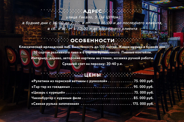 | «Ирландия славится и своими пирогами, поэтому в скором времени они появятся и у нас — свежие, собственного приготовления. Также есть бургеры и стейки. Сложно представить классический паб без этих блюд». |