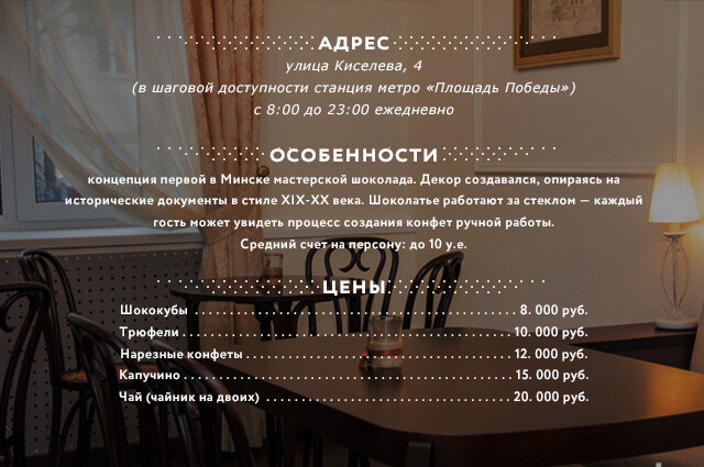 Аналогов открывающемуся заведению на Киселева, 4 (станция метро «Площадь Победы») в столице пока нет: на глазах у посетителей здесь создают 21 вид конфет ручной работы! Интерьер — детальное воплощение «кофейных» традиций XIX-XX века. relax.by стал первым порталом, который сумел заглянуть на кухню «Стараменскай Майстэрні Шакаладу».